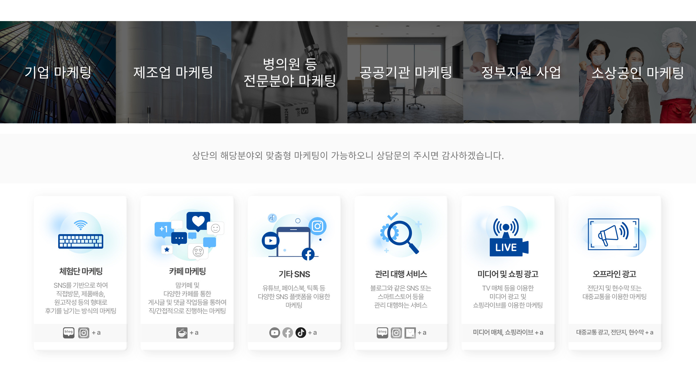 인스타그램, 페이스북, 유튜브, 틱톡 등 여러 SNS를 이용하는 고객들에게 내 업체를 더 많이 노출시켜 방문 고객을 확보할 수 있습니다.